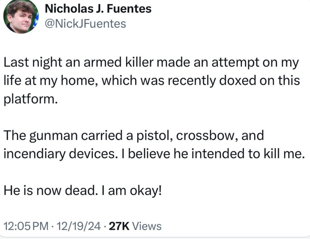 "Last night an armed killer made an attempt on my life at my home, which was recently doxed on this platform. According to police, the would-be assassin committed a triple homicide in southern Illinois early yesterday before he arrived at my doorstep with his pistol drawn, calling my name. … Doxing is not a game. This nihilistic lynch mob behavior must end before anyone else is killed."