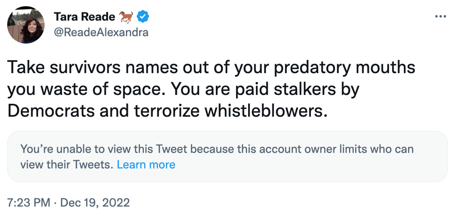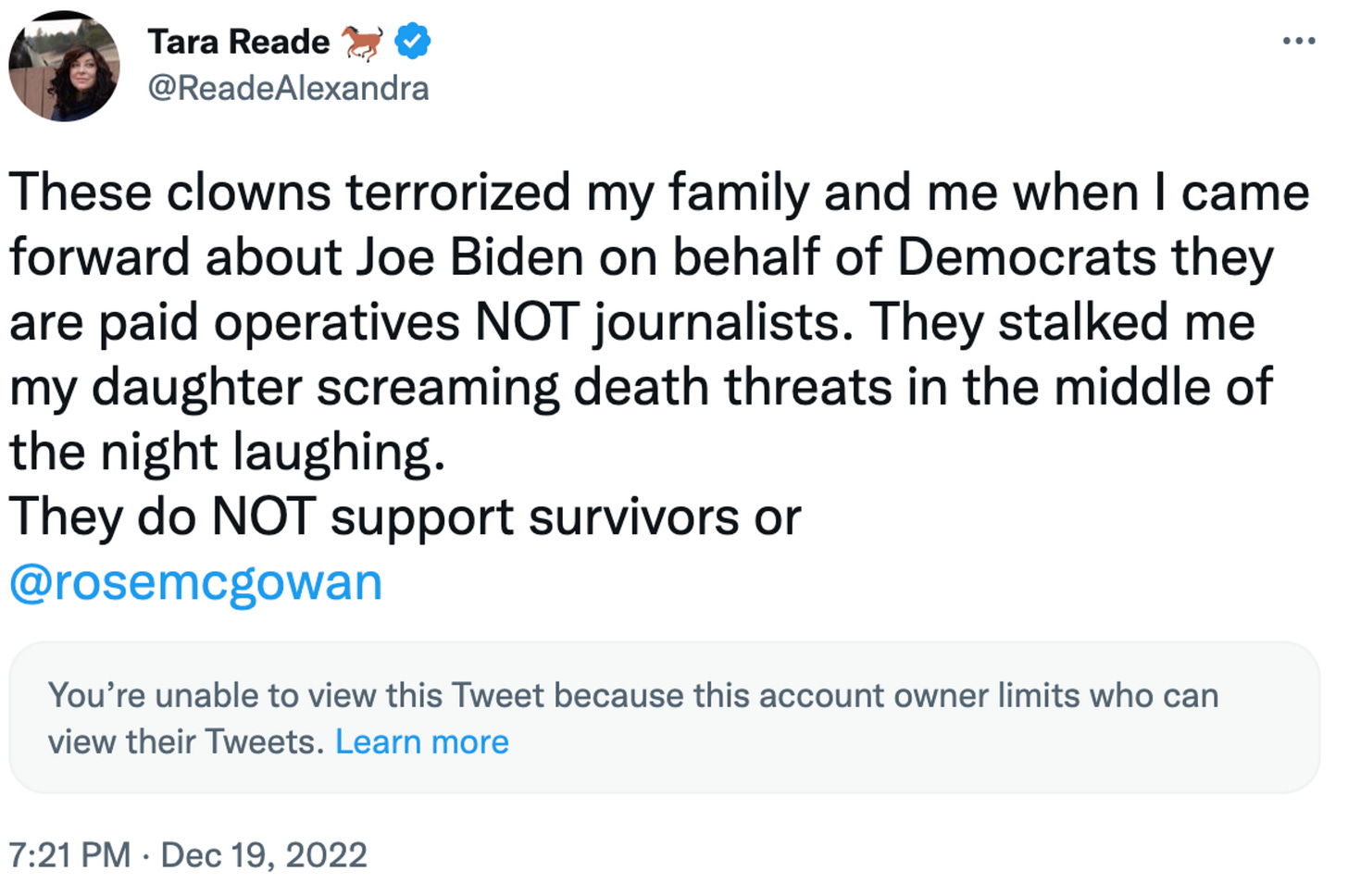 During our investigation, Tara Reade made baseless allegations on Twitter, defaming our team by accusing us of being Democratic operatives who had relentlessly harassed and threatened her and her family. She went so far as to claim that we had hacked her and that there were police reports to back up her claims. When asked by individuals on a Twitter spaces room to produce these reports, Reade initially stated that she didn't have physical copies but later claimed that she had a recording of our team making threats. She promised to release it publicly, but when pressed to do so, failed to follow through on her promise.
