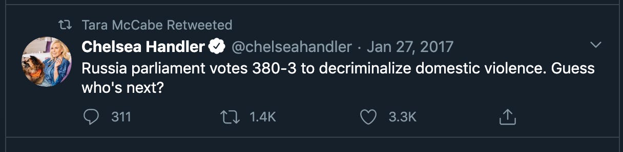 However, evidence indicates that Reade was already aware of Russia's stance on domestic violence a year before her writings. In January 2017, as you recall, she retweeted and "liked" a tweet by Chelsea Handler that condemned Russia's inhumane handling of domestic violence.