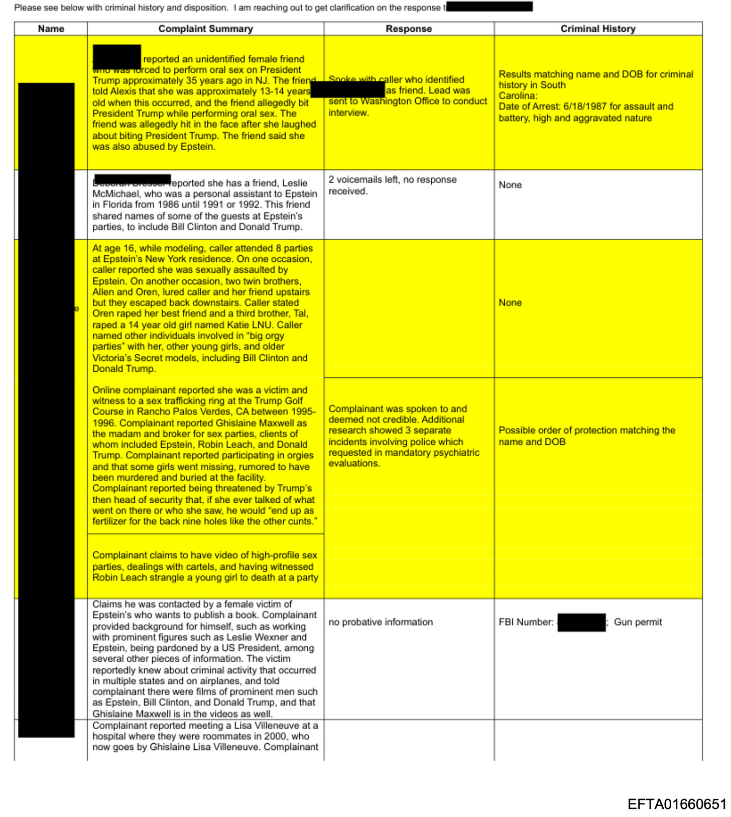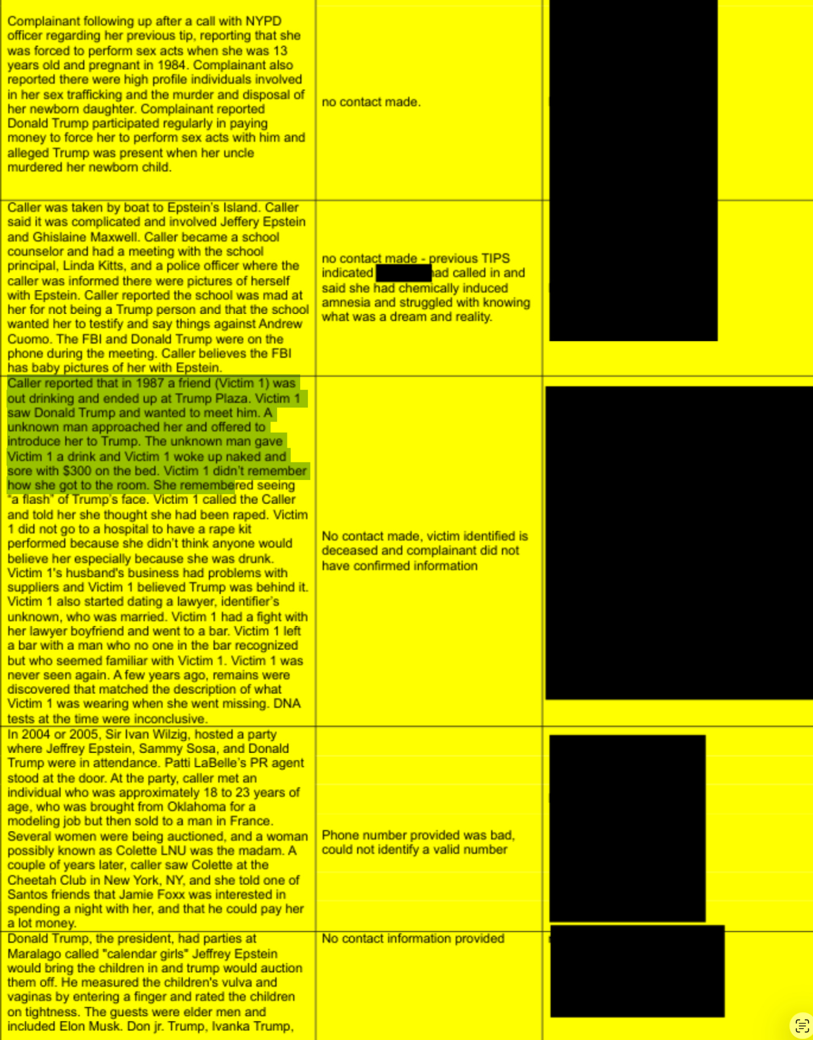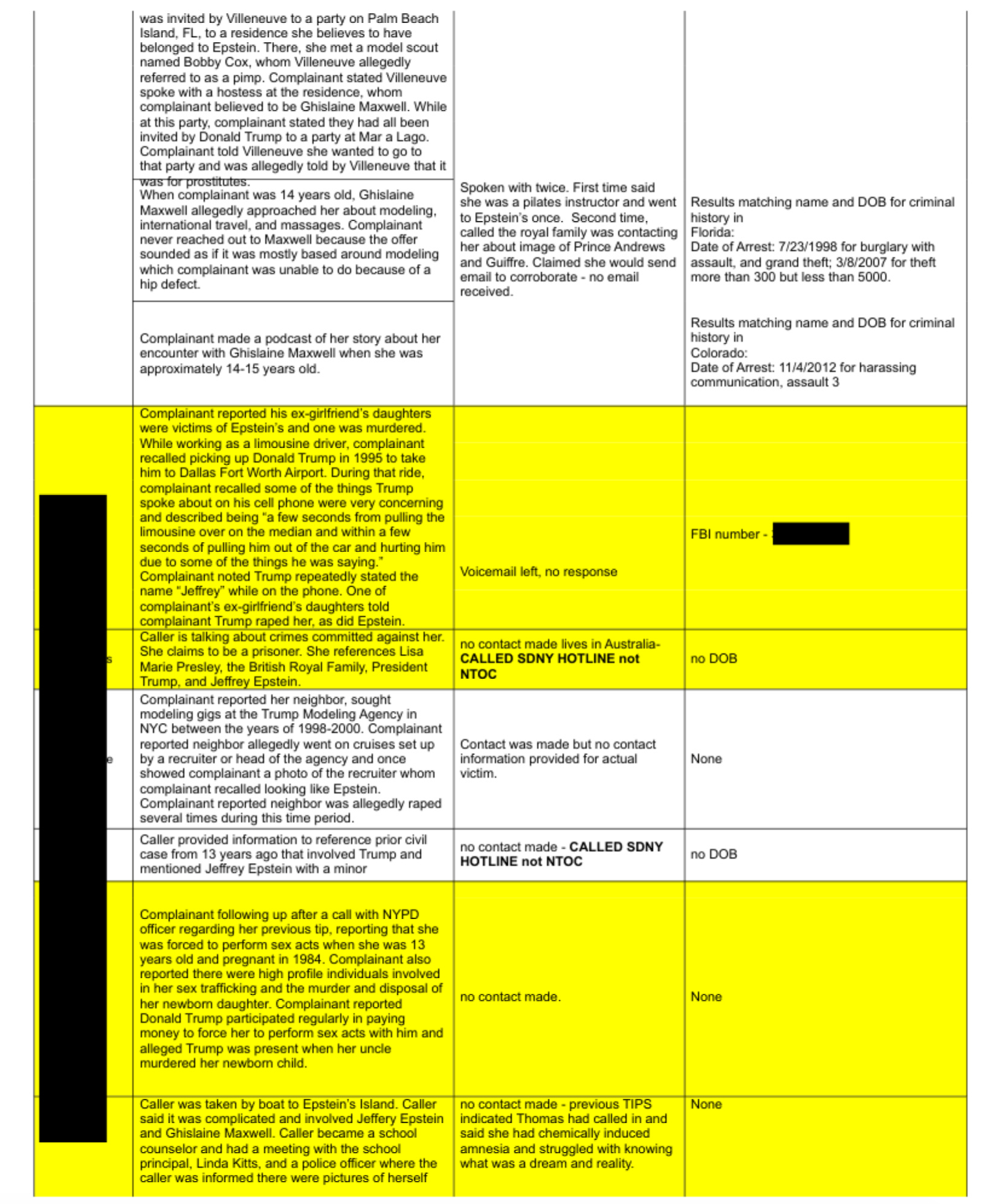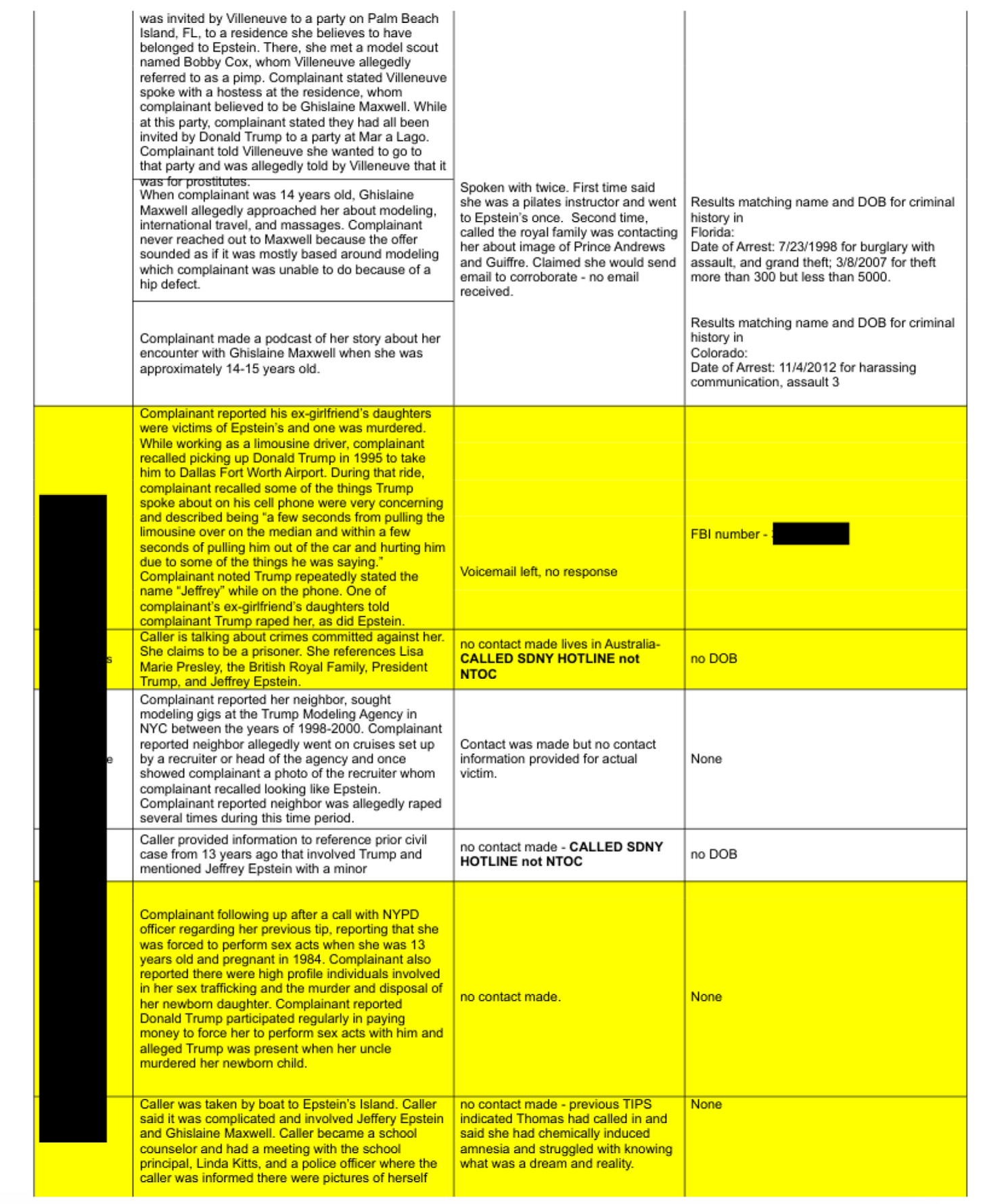 Among the allegations described in the removed documents were claims that Trump attended gatherings where young women were trafficked, that he was present at events connected to Epstein, and that complainants believed he participated in or witnessed criminal conduct. Some entries referenced Mar a Lago. Others referenced Epstein properties. Several described Trump being named alongside Epstein and Ghislaine Maxwell in accounts provided by callers to federal tip lines.
