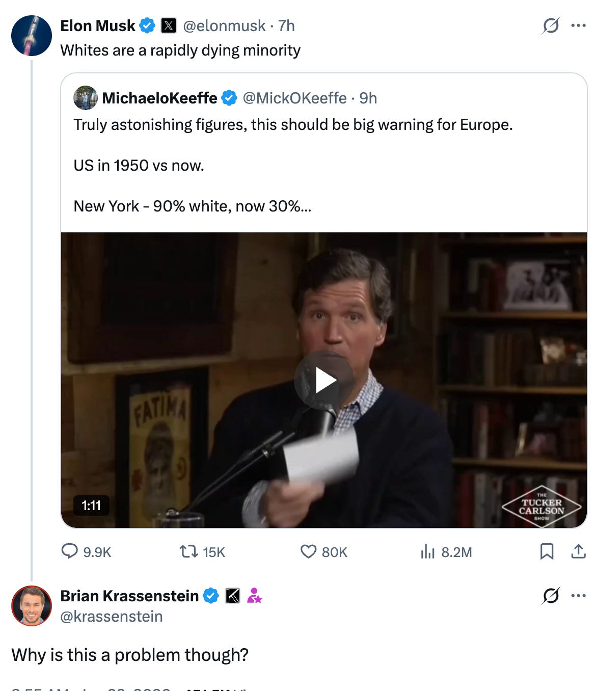Elon posted demographic data showing that white populations in large US cities are declining relative to minority groups. He followed it with a loaded conclusion: