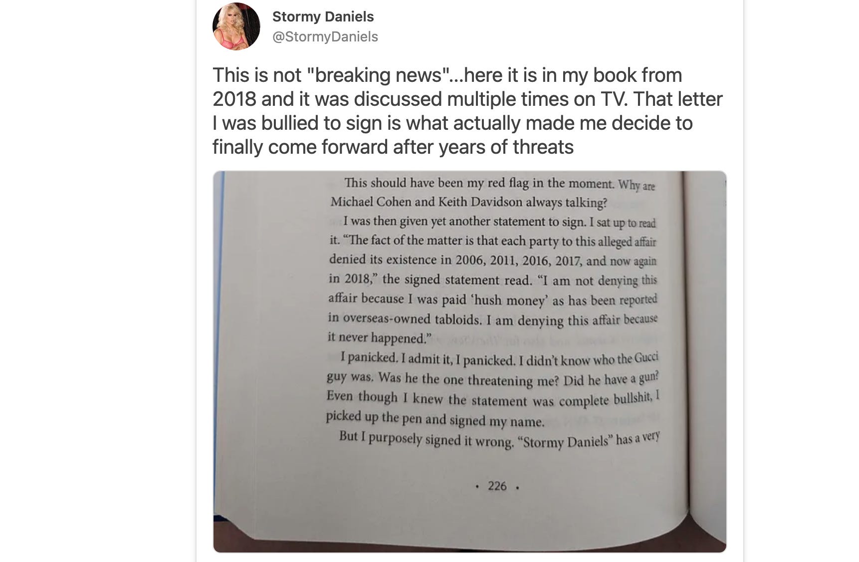 Stormy Daniels herself just took to Twitter to quash this notion that she never had an affair with Trump, sharing an image of her book and declaring, "This is not 'breaking news'...here it is in my book from 2018 and it was discussed multiple times on TV. That letter I was bullied to sign is what actually made me decide to finally come forward after years of threats."