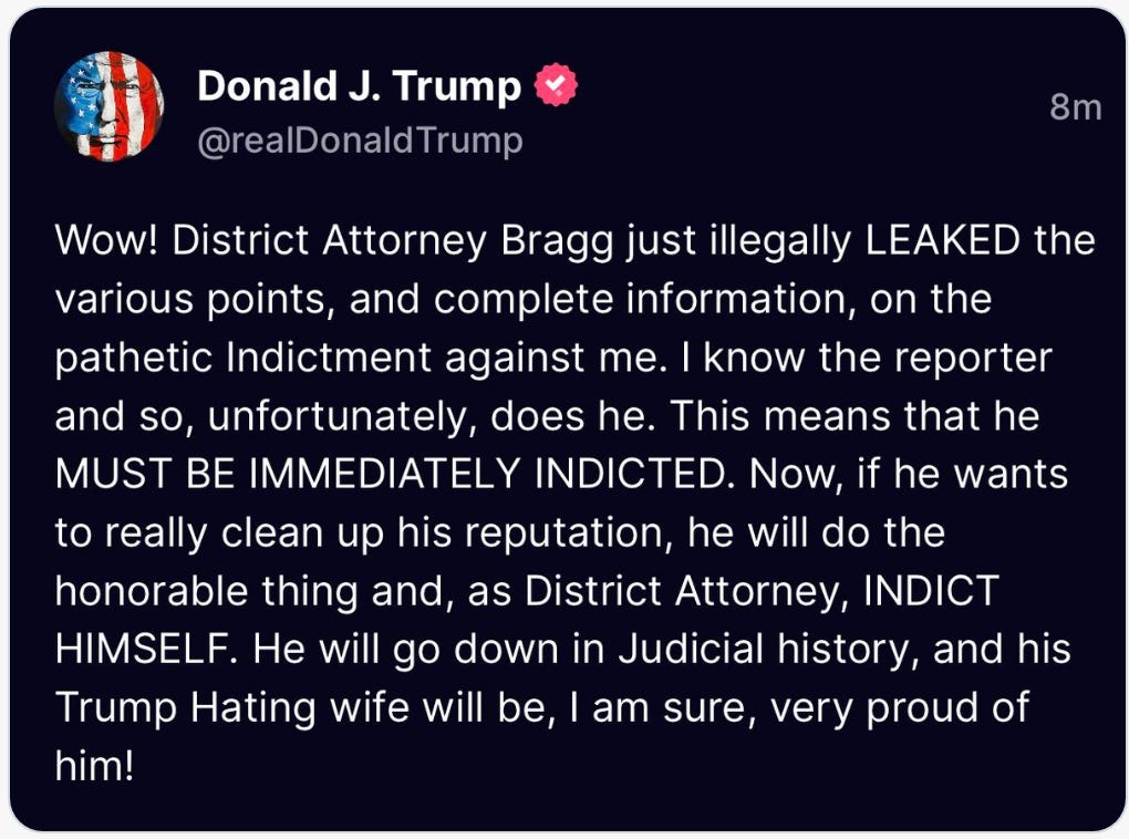 "Wow! District Attorney Alvin Bragg just illegally LEAKED the various points and complete information...This means that he MUST BE IMMEDIATELY INDICTED."